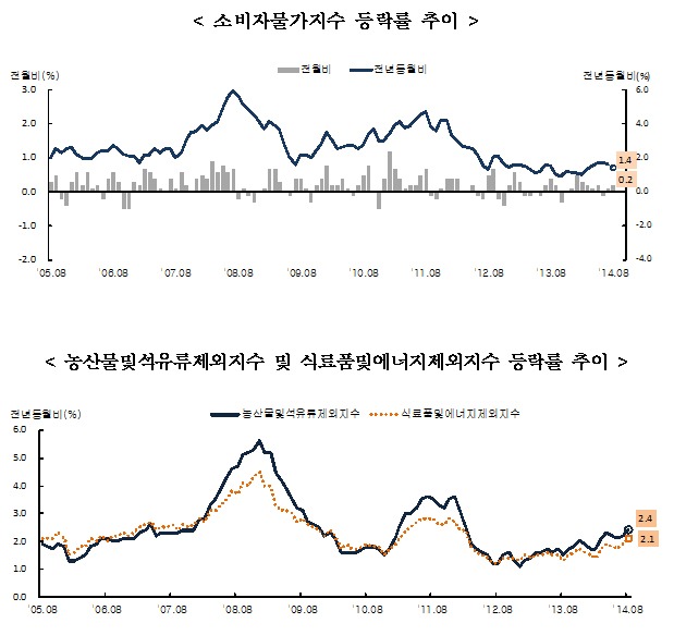 2일 통계청이 발표한 8월 소비자물가 동향에 따르면 지난달 소비자물가는 지난해 8월에 비해(전년동월대비) 1.4% 올랐다. 지난 5월과 6월에 물가상승률이 1.7%, 7월에 1.6%를 기록한데 이어 지난달 1.4%를 기록하면서, 물가상승률이 2개월 연속 꺾인 모습이다.