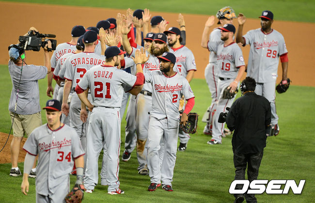 경기후 워싱턴 선수들이 승리 하이파이브를 하고 있다./ jpnews@osen.co.kr