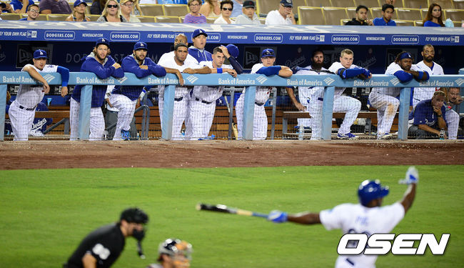 9회말 2사에서 다저스 선수들이 더그아웃에서 푸이그가 파울을 날리자 아쉬워하고 있다. /jpnews@osen.co.kr