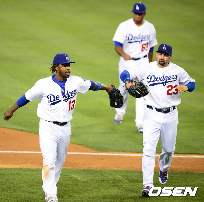 8회초 수비를 마치고 다저스 라미레즈와 곤잘레스가 글러브를 맞대며 더그아웃으로 향하고 있다. /jpnews@osen.co.kr