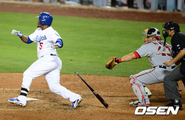 7회말 1사 1,3루에서 다저스 유리베가 1타점 중전 적시타를 날리고 있다. /jpnews@osen.co.kr
