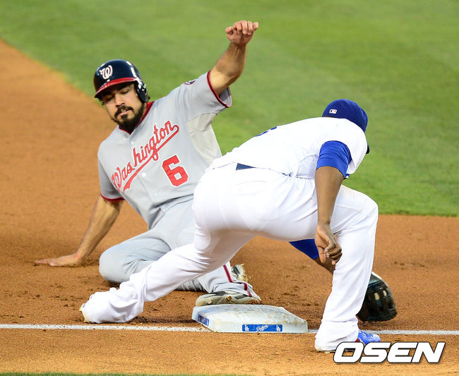 7회초 무사 1,2루에서 워싱턴이 더블스틸을 시도하며 렌던이 다저스 유리베의 태그에 앞서 세이프 되고 있다. /jpnews@osen.co.kr