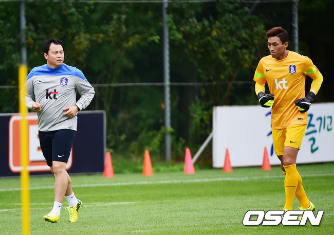 김승규가 훈련을 할때 이운재 코치와 얘기를 나누고 있다.