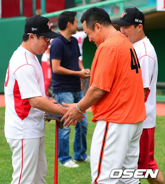 2일 오후 인천 문학구장에서 열리는 2014 한국야쿠르트 세븐 프로야구 SK 와이번스와 한화 이글스의 경기에 앞서 한화 조인성이 SK 김태형 코치와 악수를 나누고 있다