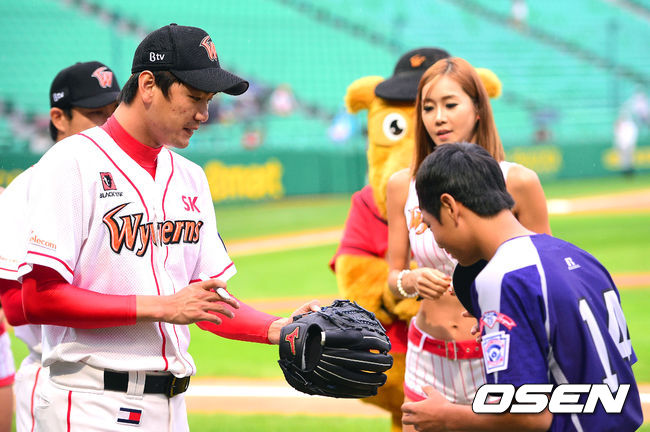2일 오후 인천 문학구장에서 열리는 2014 한국야쿠르트 세븐 프로야구 SK 와이번스와 한화 이글스의 경기에 앞서 리틀야구 월드시리즈에서 우승한 한국 리틀야구단 문태민(남동리틀야구단)과 신동완(부평리틀야구단)에게 야구용품을 지원하는 행사를 가졌다.