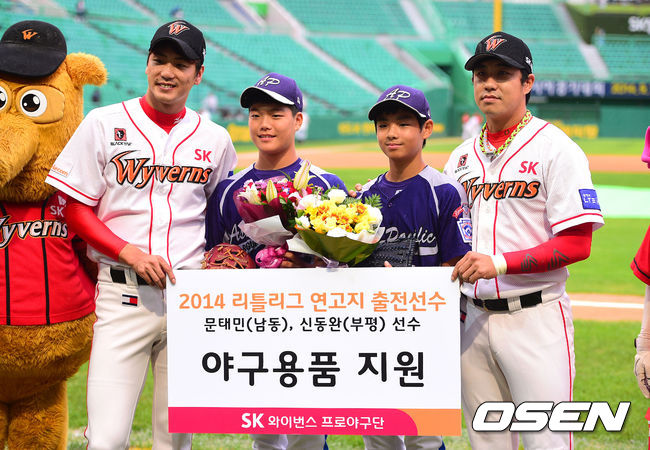 2일 오후 인천 문학구장에서 열리는 2014 한국야쿠르트 세븐 프로야구 SK 와이번스와 한화 이글스의 경기에 앞서 리틀야구 월드시리즈에서 우승한 한국 리틀야구단 문태민(남동리틀야구단)과 신동완(부평리틀야구단)에게 야구용품을 지원하는 행사를 가졌다.