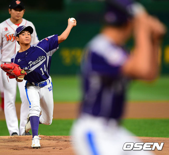 2일 오후 인천 문학구장에서 열린 2014 한국야쿠르트 세븐 프로야구 SK 와이번스와 한화 이글스의 경기에 앞서 리틀야구 월드시리즈에서 우승한 한국 리틀야구단 문태민(남동리틀야구단)과 신동완(부평리틀야구단)이 시타 시구를 하고 있다.