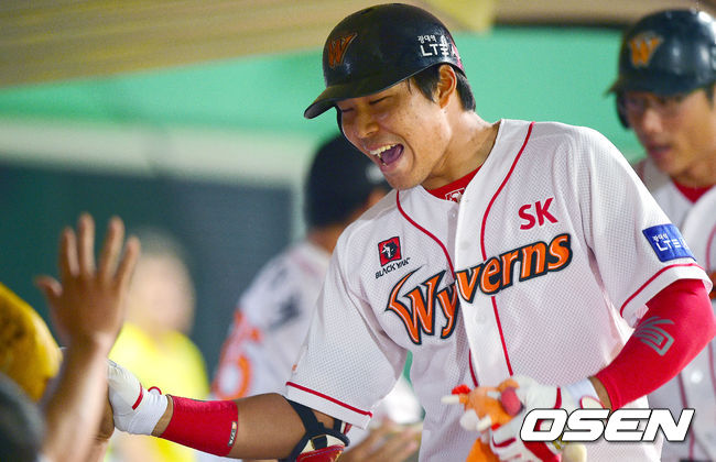 2일 오후 인천 문학구장에서 열린 2014 한국야쿠르트 세븐 프로야구 SK 와이번스와 한화 이글스의 경기,4회말 1사 만루 SK 한동민이 만루홈런을 날리고 기뻐하고 있다.