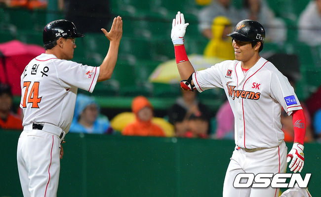 2일 오후 인천 문학구장에서 열린 2014 한국야쿠르트 세븐 프로야구 SK 와이번스와 한화 이글스의 경기,4회말 1사 만루 SK 한동민이 만루홈런을 날리고 조원우 코치와 하이파이브를 하고 있다