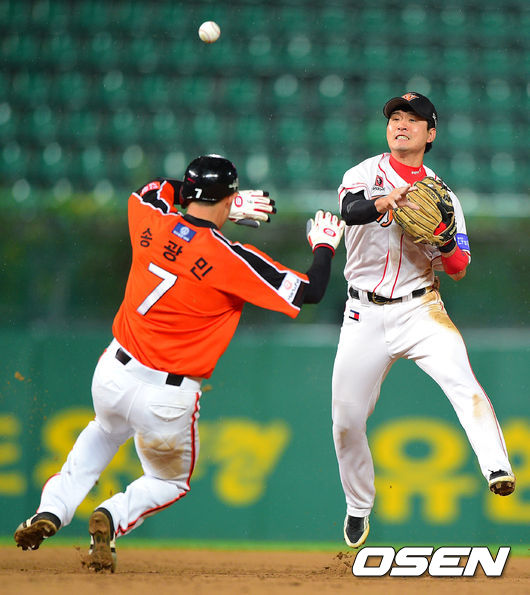2일 오후 인천 문학구장에서 열린 2014 한국야쿠르트 세븐 프로야구 SK 와이번스와 한화 이글스의 경기,5회초 1사 1,3루 한화 김경언의 병살타때 김성현 유격수가 1루 주자 송광민을 포스아웃 시킨뒤 1루로 송구하고 있다.