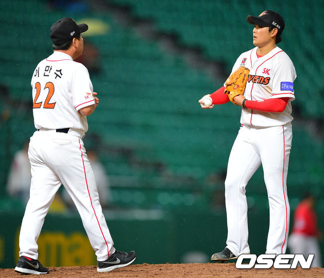 2일 오후 인천 문학구장에서 열린 2014 한국야쿠르트 세븐 프로야구 SK 와이번스와 한화 이글스의 경기,5회초 1사 1,3루 SK 선발투수 문광은이 교체되고 있다. 문광은은 이날 4⅓이닝 2실점 호투했으나 데뷔 첫 승을 놓쳤다.