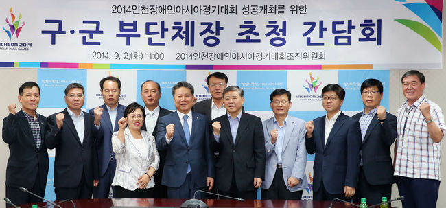 2014인천장애인아시아경기대회조직위원회(위원장 김성일, 이하 조직위)는 2일 미추홀타워 19층 영상회의실에서 대회 성공개최를 위한 인천시 구·군 부단체장 초청 간담회를 열었다.