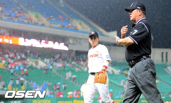 2일 오후 인천 문학구장에서 열린 2014 한국야쿠르트 세븐 프로야구 SK 와이번스와 한화 이글스의 경기,폭우로 경기가 중단되고 있다.