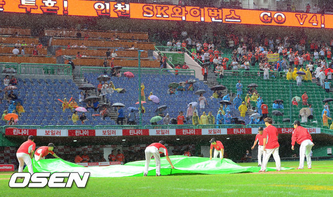 홈런 2방씩을 주고받으며 공방전을 벌인 SK와 한화가 승부를 가리지 못했다. 비가 두 팀의 결판을 막았다.
