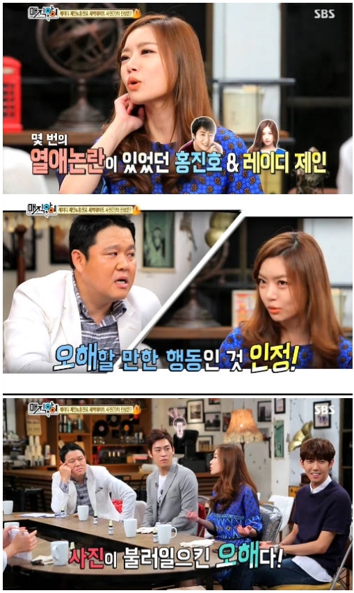 이날 레이디 제인은 녹화일 화제가 된 홍진호와의 열애설에 대해 적극적으로 해명했다. 레이디 제인은 "열애면 손잡고 있는 사진이 찍히지 않았겠나. 새벽1시에 초밥을 먹으러 갔고, 허벅지에 점이 있어서 '여기 점이 있네'라고 말한 상황이었다"라고 설명했다.