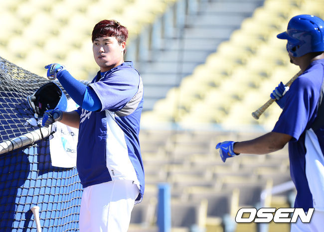 경기에 앞서 다저스 류현진이 타격 훈련을 하며 프리아스에 먼저 배팅 게이지에 들어가라고 손짓하고 있다.