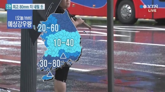 오늘도 강원도와 전남, 경남 남해안, 지리산부근, 제주산간에는 30~80mm의 비가 더 내리겠다. 서울·경기와, 충남 서해안, 경남, 제주도 20~60mm, 그밖의 충청과 전북, 경북에는 10∼40mm의 비가 예상된다.