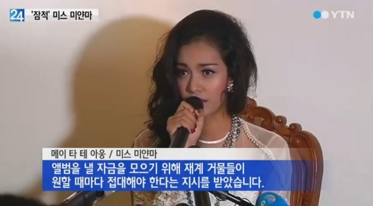 아웅은 지난 5월 한국의 단체가 주최한 '미스 아시아 퍼시픽 월드 2014'에 미얀마 대표로 출전해 우승했지만 지난달 27일 주최 측이 우승을 취소하자 시가 2억 원에 달하는 왕관과 함께 잠적했다.