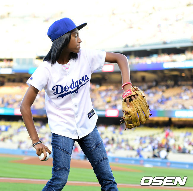 경기에 앞서 리틀리그 월드시리즈 예선경기에서 여자 선수 최초로 승리를 거둔 모네 데이비스가 하고 있다.
