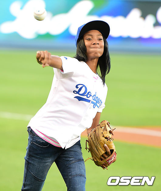 경기에 앞서 리틀리그 월드시리즈 예선경기에서 여자 선수 최초로 승리를 거둔 모네 데이비스가 하고 있다.