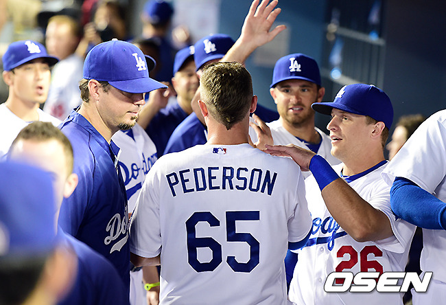 2회말 2사에서 메이저리그 첫 안타를 신고한 다저스 페더슨이 더그아웃에서 동료선수들의 축하를 받고 있다.