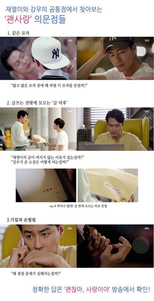 글에 대한 남다른 애정을 갖고 있다는 점 또한 두 사람의 공통점이다. 강우가 실제하고 있는 인물이 아니라는 것을 알게 된 시청자들은 강우가 재열에게 건넨 소설 역시 허상일지, 허상이라면 소설 내용까지 재열이 만들어낸 것일지 궁금해 하고 있다. 또한 최근 "글이 잘 안 써진다"며 고민하는 재열의 모습들이 자주 포착돼 글로 연결된 두 사람 사이에 어떠한 연관성이 있지 않을까 의문을 제기하고 있다.
