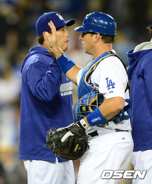 경기후 다저스 류현진이 엘리스와 승리 하이파이브를 하고 있다./ jpnews@osen.co.kr