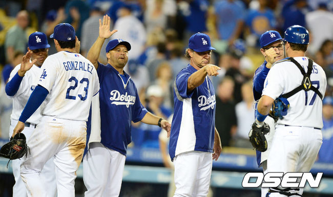 경기후 다저스 매팅리 감독이 선수들과 승리 하이파이브를 하고 있다./ jpnews@osen.co.kr