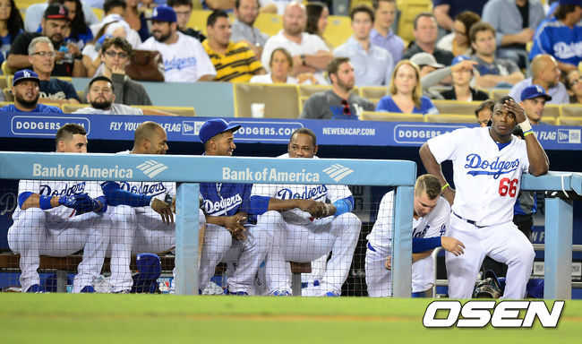 9회초 라인업에서 제외된 다저스 푸이그가 더그아웃에서 경기를 지켜보고 있다./ jpnews@osen.co.kr