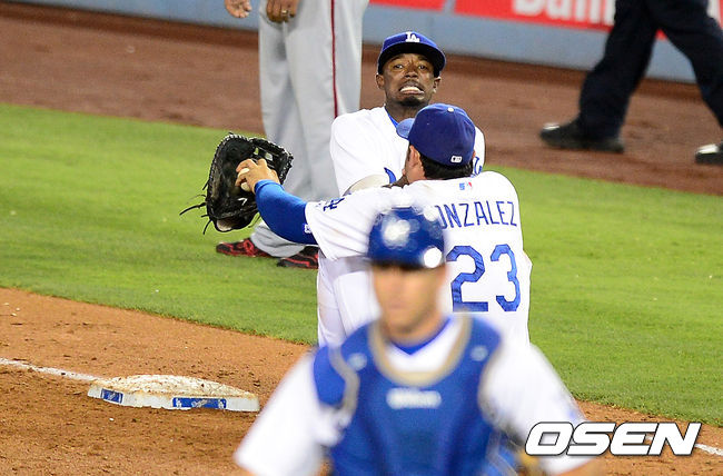 7회초 다저스 고든이 수비하다 넘어진 곤잘레스를 일으켜 세워주고 있다./ jpnews@osen.co.kr