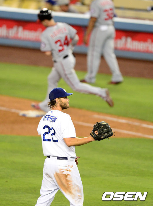 7회초 2사에서 다저스 커쇼가 워싱턴 하퍼에 솔로포를 허용하며 아쉬워하고 있다./ jpnews@osen.co.kr
