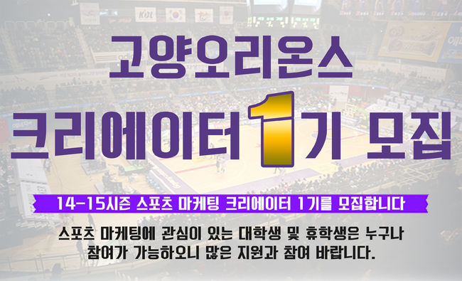 프로농구 고양 오리온스가 2014-2015시즌 동안 구단 사무국과 함께할 프로농구 스포츠마케팅 현장 체험단(이하 ‘크리에이터’)를 공개 모집한다.