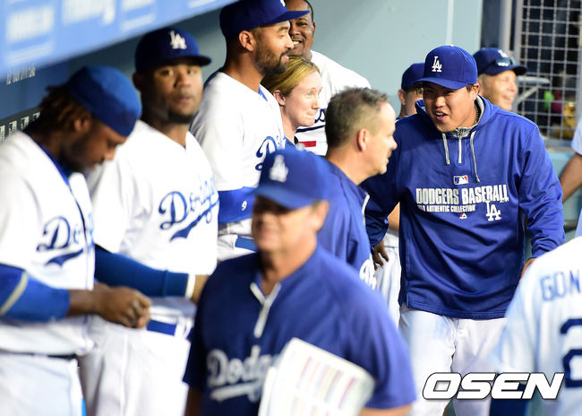 경기에 앞서 다저스 류현진이 더그아웃에서 미소를 지으며 즐거워하고 있다./ jpnews@osen.co.kr