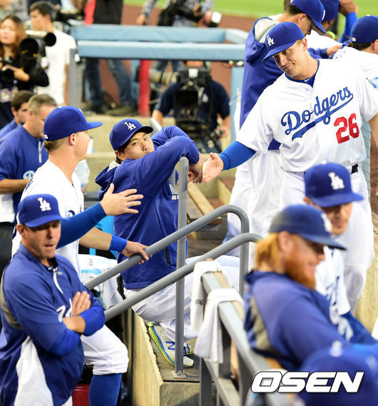 경기에 앞서 다저스 류현진이 더그아웃에서 미소를 지으며 즐거워하고 있다./ jpnews@osen.co.kr