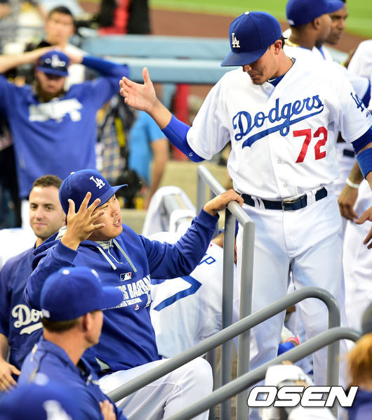 경기에 앞서 다저스 류현진이 더그아웃에서 로하스와 하이파이브를 하고 있다./ jpnews@osen.co.kr