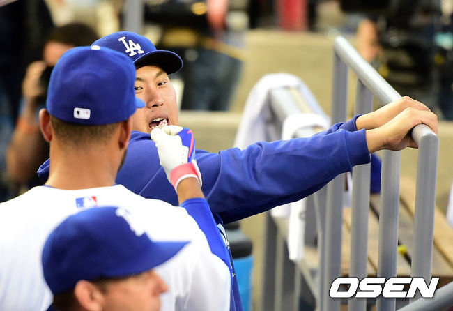 경기에 앞서 다저스 류현진이 맷 켐프가 주먹을 내밀자 귀찮다는 표정을 짓고 있다./ jpnews@osen.co.kr