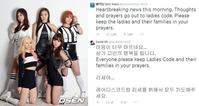 또한 ‘위대한 탄생 시즌2’ 출신인 에릭남은 “오늘 아침에 가슴이 찢어지는 소식을 들었어요. 관심과 기도를 레이디스코드에게 보내주세요. 레이디스코드와 그들의 가족을 위해 기도해주세요”라고 놀란 심정과 슬픔을 감추지 못했다.