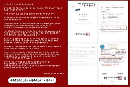 금일 국가공인시험인증기관인 한국화학융합시험연구원으로부터 ‘경구독성테스트’ 시험결과를 통보받아 고객님들께 알려드립니다. 이 시험은 지난 7월 21일 몽드드가 직접 한국화학융합시험연구원에 접수, 의뢰하여 식품의약품안전처 고시 제2014-136호에 시험방법에 따라 진행되어 9월 1일 완료되었으며, 금일 결과를 통보받았습니다. 경구독성 이란 입을 통한 섭취에 따른 독성입니다.
