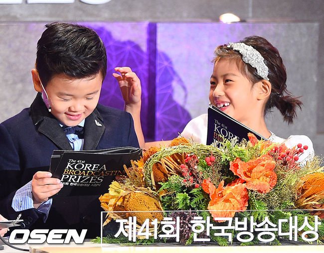 3일 오후 서울 KBS홀에서 진행된 제41회 한국방송대상 시상식에서 윤후와 지아가 시상에 나서 인사말을 하고 있다.