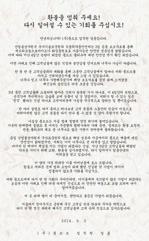 이에 몽드드는 "이번 논란을 종결 지을 수 있는 곳은 식약처 밖에 없다"면서 "몽드드는 식품의약품안전처에서 해당 성분에 대한 공식적인 입장을 발표해 주실 것을 간곡히 촉구한다"고 설명했다.