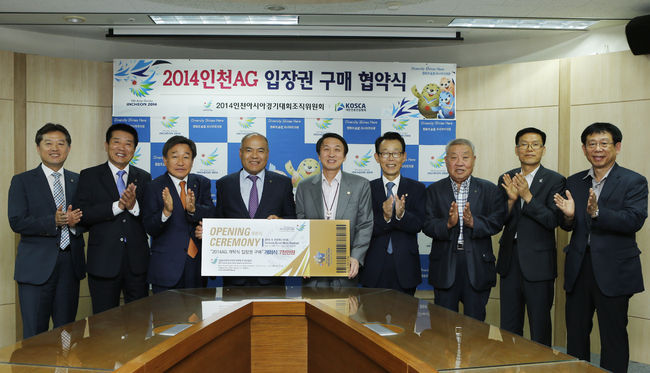 2014 인천아시아경기대회 조직위원회(위원장 김영수)는 3일 오후 인천 송도 미추홀타워 조직위 영상회의실에서 대한전문건설협회(중앙회 회장 표재석)와 인천AG 입장권 전달식을 가졌다.