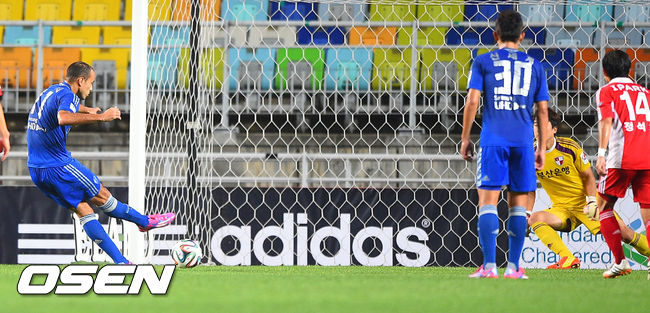 3일 오후 수원월드컵경기장에서 열린 현대오일뱅크 K리그 클래식 2014 수원 삼성과 부산 아이파크의 경기,전반 수원 로저가 페널티킥으로 선취골을 넣고 있다.