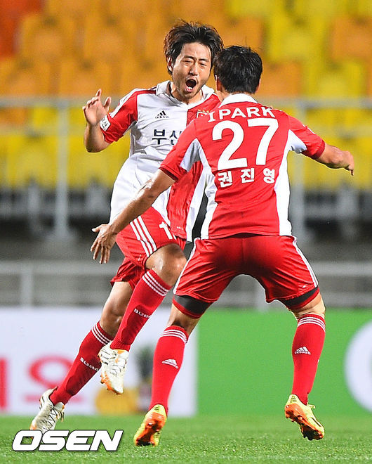 3일 오후 수원월드컵경기장에서 열린 현대오일뱅크 K리그 클래식 2014 수원 삼성과 부산 아이파크의 경기,후반 부산 김익현이 동점 프리킥골을 넣은 후 환호하고 있다.