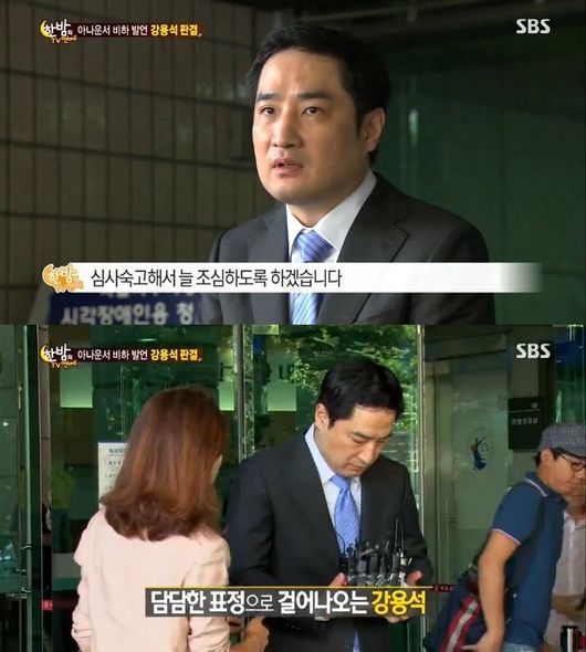 3일 오후 8시 55분 방송된 SBS '한밤의 TV연예'에는 아나운서 비하 발언으로 지난달 말 1500만원의 벌금형을 받은 강용석의 모습이 담겼다.