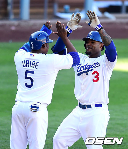 연장 12회말 2사 1루에서 다저스 크로포드가 동점 투런포를 날리고 홈을 밟으며 유리베와 하이파이브를 하고 있다.