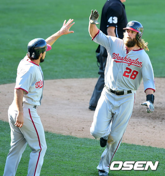 12회초 1사 만루에서 워싱턴 라로쉬의 2타점 좌전 적시타에 워스가 홈을 밟으며 기뻐하고 있다./ jpnews@osen.co.kr