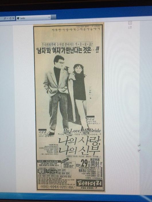 박중훈은 지난 3일 오후 자신의 트위터를 통해 “1990년 최진실과 찍은 영화 '나의사랑 나의신부' 광고입니다. 당시에는 가장 효과 있는 광고 매체가 신문이었죠. 24년 만에 리메이크 돼서 곧 개봉을 앞두고 있네요. 신기하기도 하고 기대도 되고 응원도 하고 싶네요^^”라는 글과 함께 사진 한 장을 게재했다.