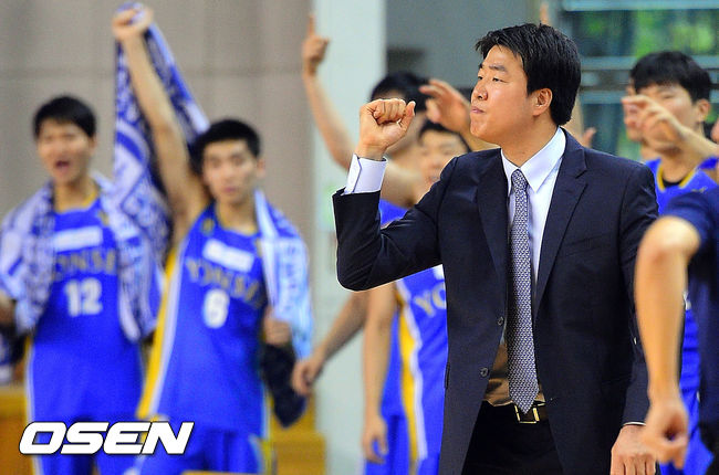 4일 오후 경기도 용인실내체육관에서 열린 2014 KB국민은행 대학농구리그 챔피언결정전 1차전 경기, 1쿼터 연세대 은희석 감독이 3점슛에 환호하고 있다.