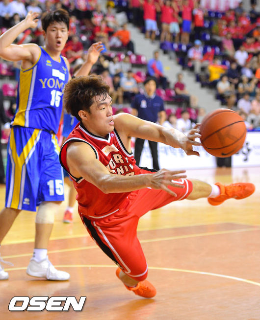 4일 오후 경기도 용인실내체육관에서 열린 2014 KB국민은행 대학농구리그 챔피언결정전 1차전 경기, 2쿼터 고려대 이승현이 몸날려 공을 살려내고 있다.