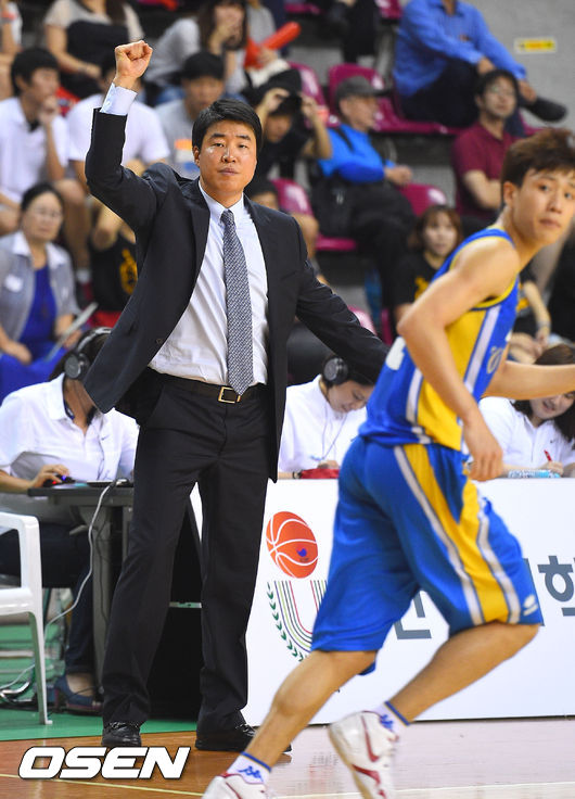 4일 오후 경기도 용인실내체육관에서 열린 2014 KB국민은행 대학농구리그 챔피언결정전 1차전 경기, 4쿼터 팽팽하던 점수가 10점 차이가 나자 연세대 은희석 감독이 환호하고 있다.